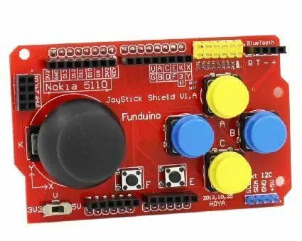 - Joystick shield basit bir şekilde Arduino üzerine oturturularak kullanışlı bir denetleyici haline dönüşür.