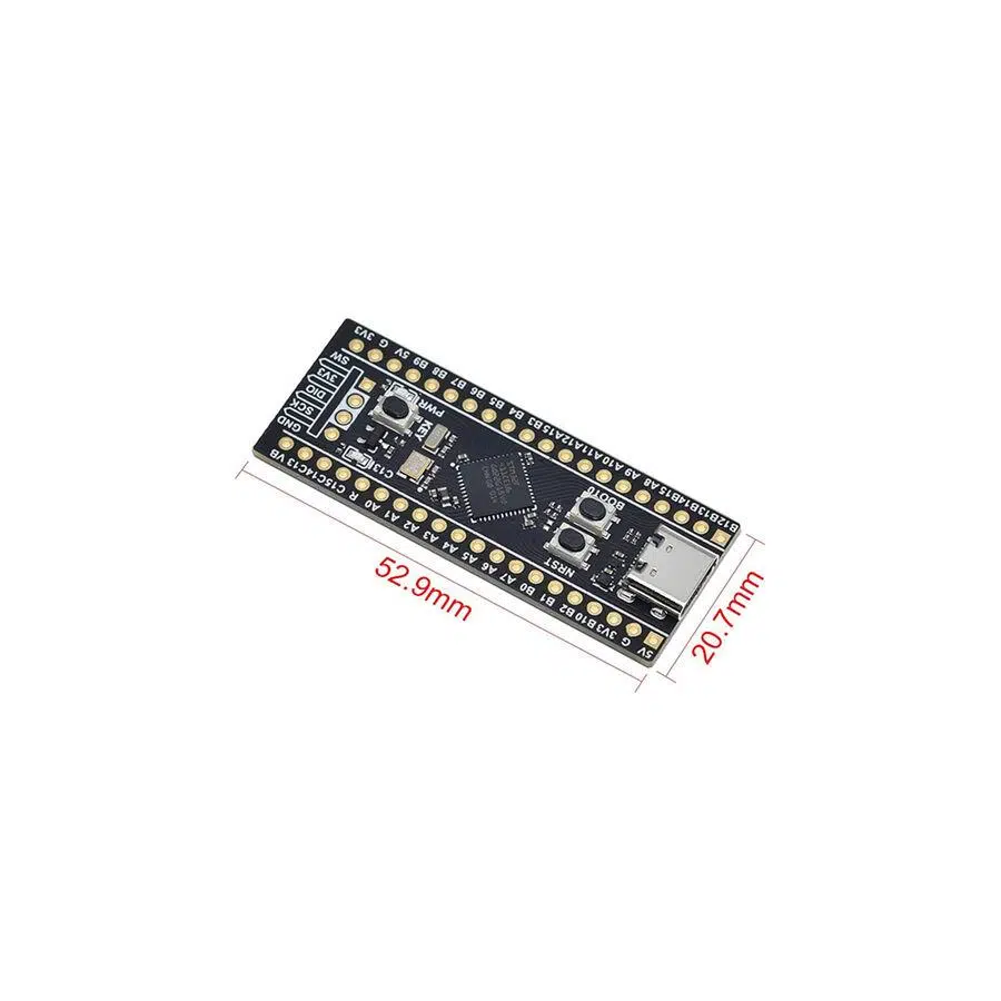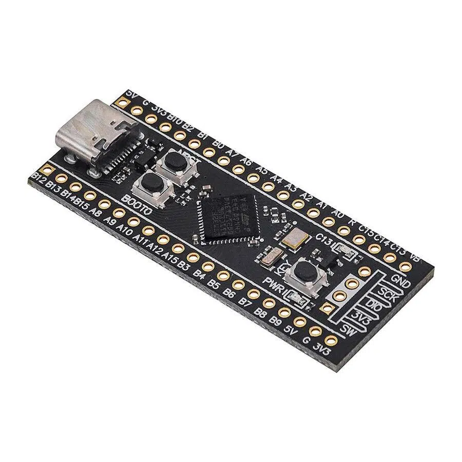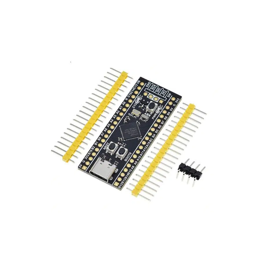 STM32F411CEU6 cortex M4 kullanılmış modül karttır. Üzerinde kristal buton pin bağlantı headerları gibi temel ihtiyaçları karşılayacak donanımları vardır. Type C usb bağlantı soketi üzerinden haberleşme ve besleme işlemleri yapılır. Güçlü ve zengin donanımı olan bu işlemci ile projelerinizi kolaylıkla gerçekleştirebilirsiniz. Boot0 butonuna basılı tutarken bilgisayara bağlarsanız Pcde DFU modda st aygıt olarak gözükmektedir. ( Gerekli driverlar yüklenmiş olması gerekebilir). Daha sonrasında harici programlayıcı gerekmeden usb üzerinden st yazılımları ile program yükleyebilirsiniz.
